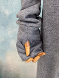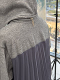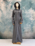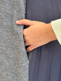 Effortlessly blending elegance with casual comfort, the Snowfall Hoodie Dress is designed to keep you warm and stylish on the go. Featuring a sleek Milton fabric front in gray, and soft pleated fabric at the back in light navy, it creates a unique two-tone look. The detachable hood, integrated gloves, zipper, and multiple pockets make it as practical as it is chic — perfect for casual outings and chilly days.